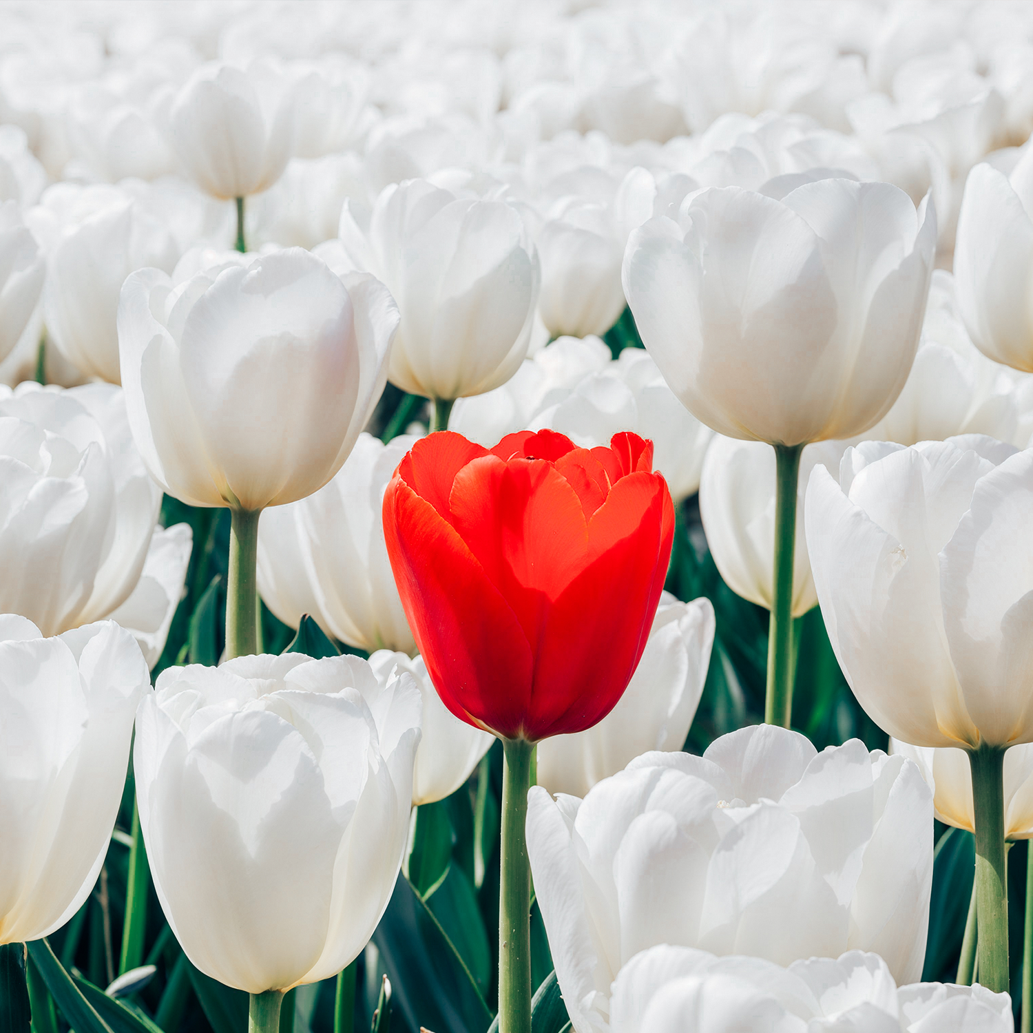 Just as the red tulip stands out in the sea of white tulips, it symbolizes the strength of being different and unique.
